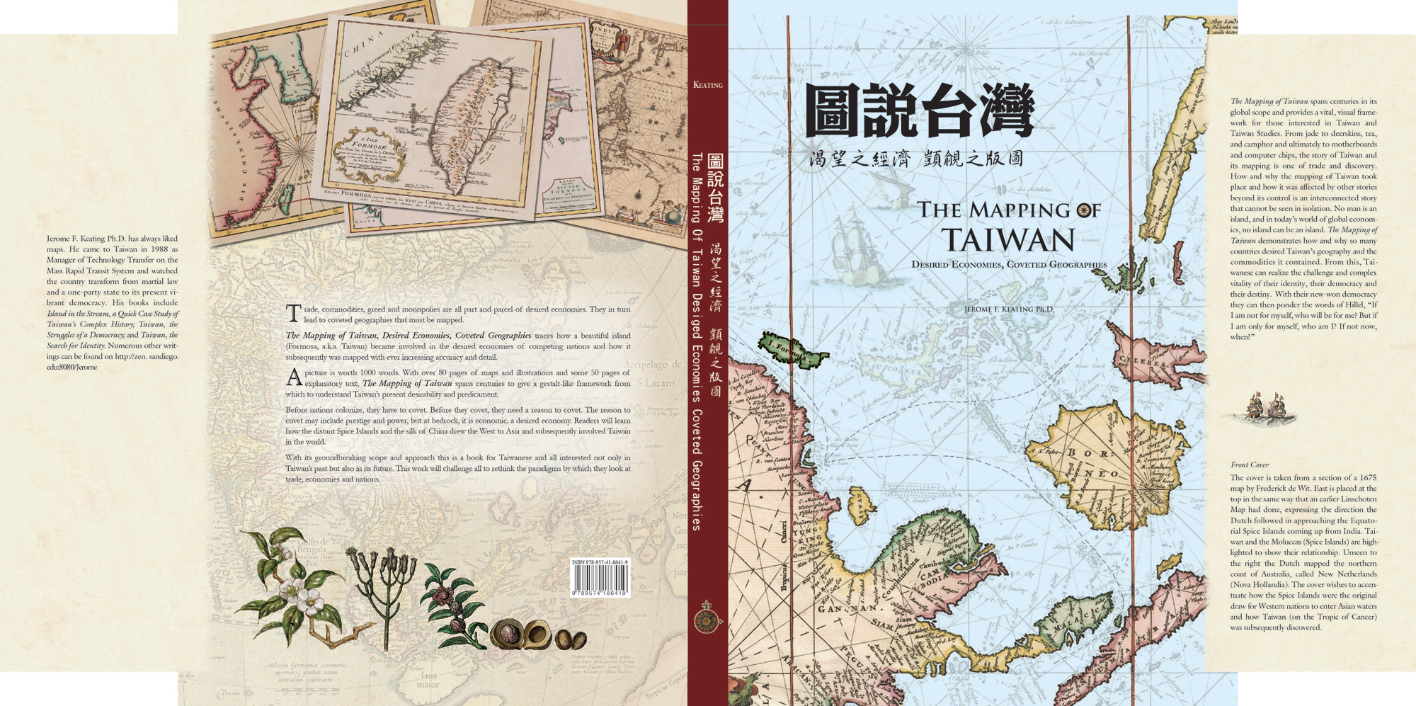In The Mapping of Taiwan, Keating steps back and places Taiwan within the shaping framework of world events and global economies. It is a Gestalt of Taiwan's history and of life, but from the crass standpoint of trade, commodities, greed and monopolies. These are all part and parcel of desired economies that often in turn lead to coveted geographies that must be mapped. This book (80 to 85 all color pages of maps and photographs that along with 50 pages of text/context) traces the historical mapping of Taiwan by numerous nations from the 1500s to the present. Included are developments in cartography, the various mapmaking houses and the artistry of maps.